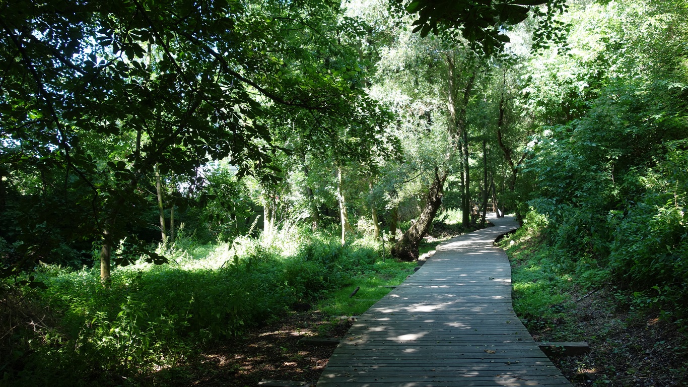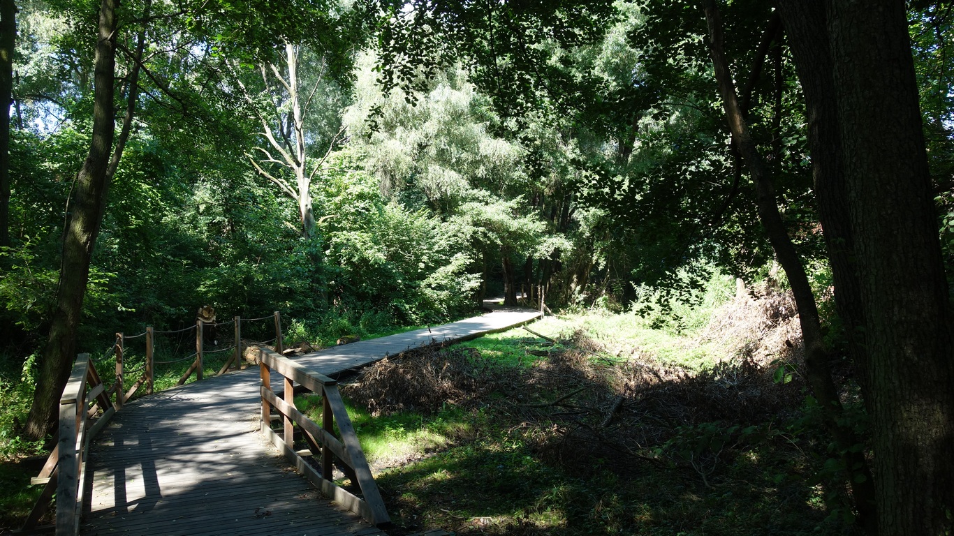 Na začátku Říčan vede podél Říčanského potoka na dřevěných chodnících a mostcích nad bahnitým terénem.