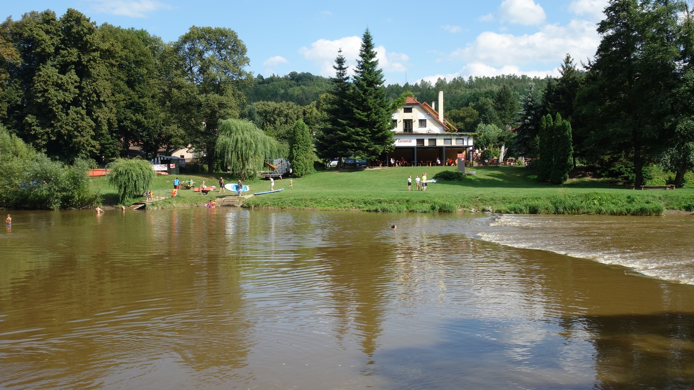 Zlenice, pohled od Hlásky kde je občerstvovna a koupání přes Sázavu na Kormorán.